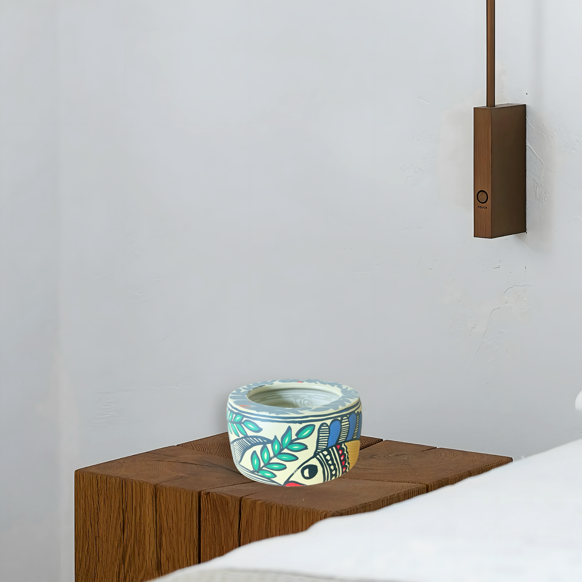 This hand-painted ash tray is adorned with traditional Madhubani art, featuring the symbolic fish motif surrounded by foliage. In Madhubani painting, the fish represents prosperity, fertility, and good luck, while leafy vines embody growth and continuity.