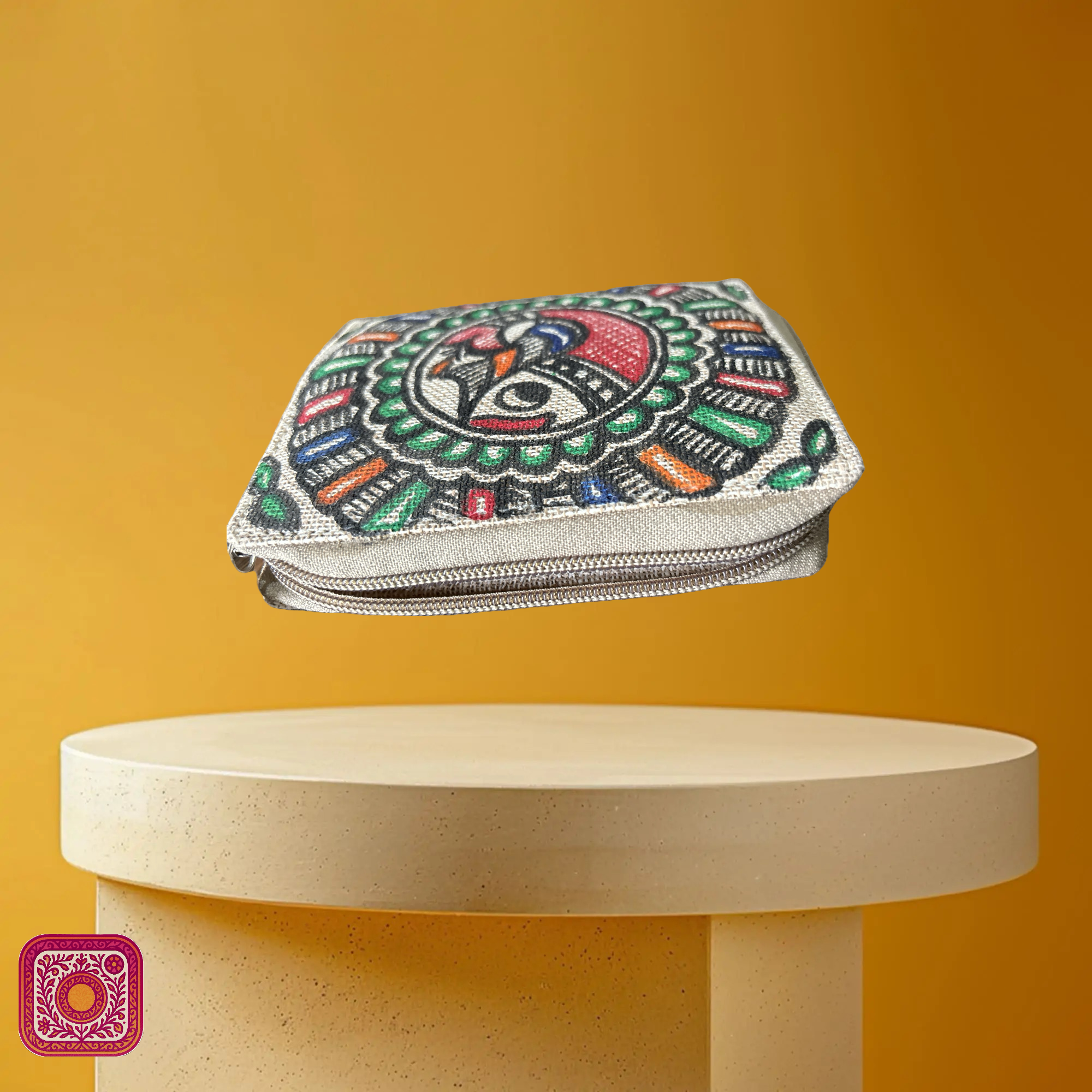 This handmade women’s wallet is beautifully hand-painted in the timeless Madhubani style, featuring intricate bird and floral motifs symbolizing prosperity and joy. Crafted on eco-friendly jute/fabric, it is lightweight yet durable, making it ideal for daily use. The full zipper closure keeps your essentials safe while the artwork makes it a unique piece of cultural heritage. A perfect blend of tradition and utility, it’s not just a wallet but a statement of art and identity.