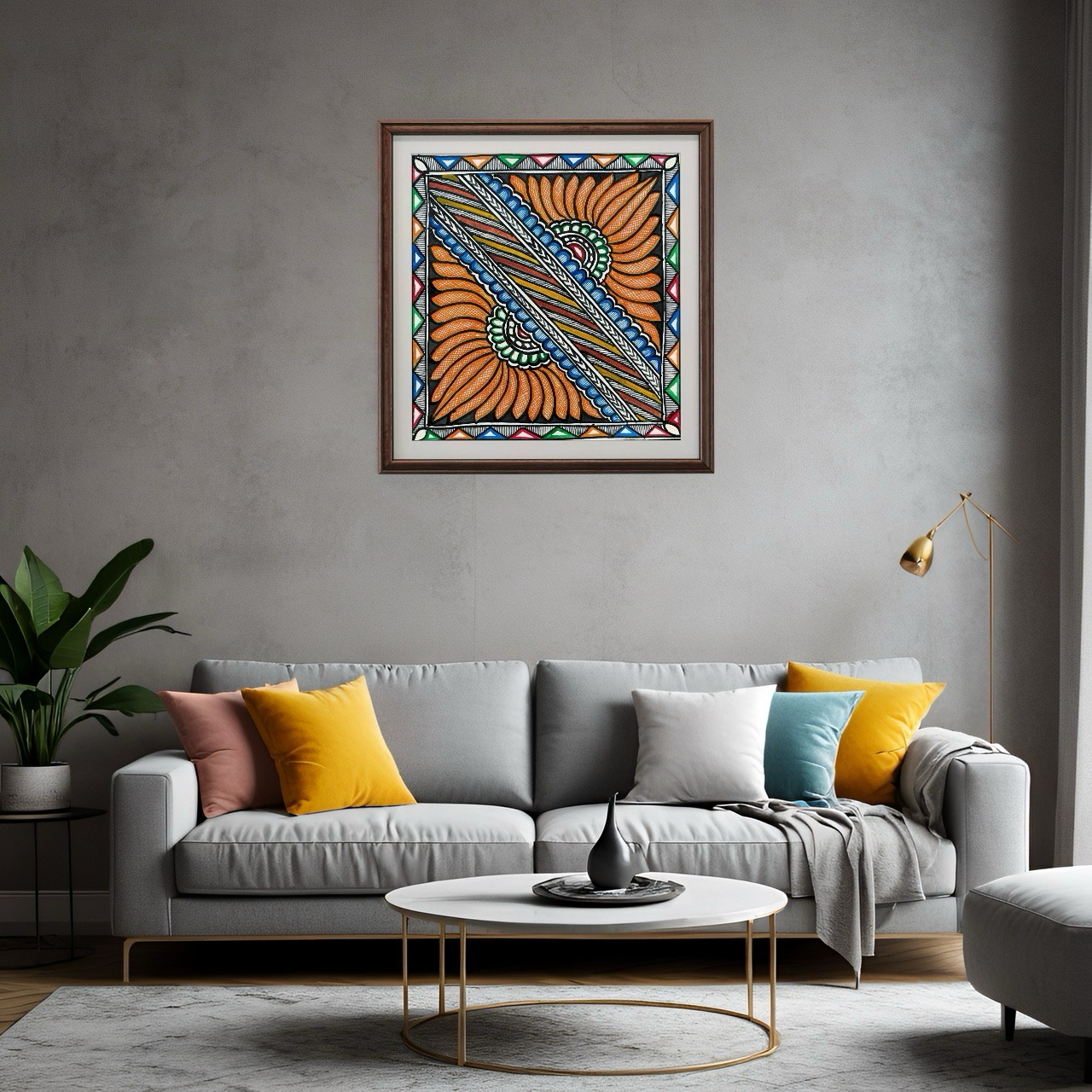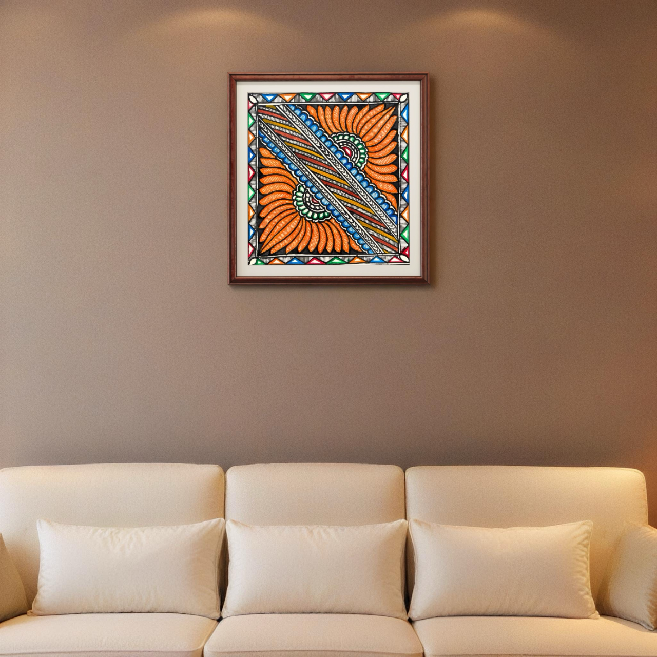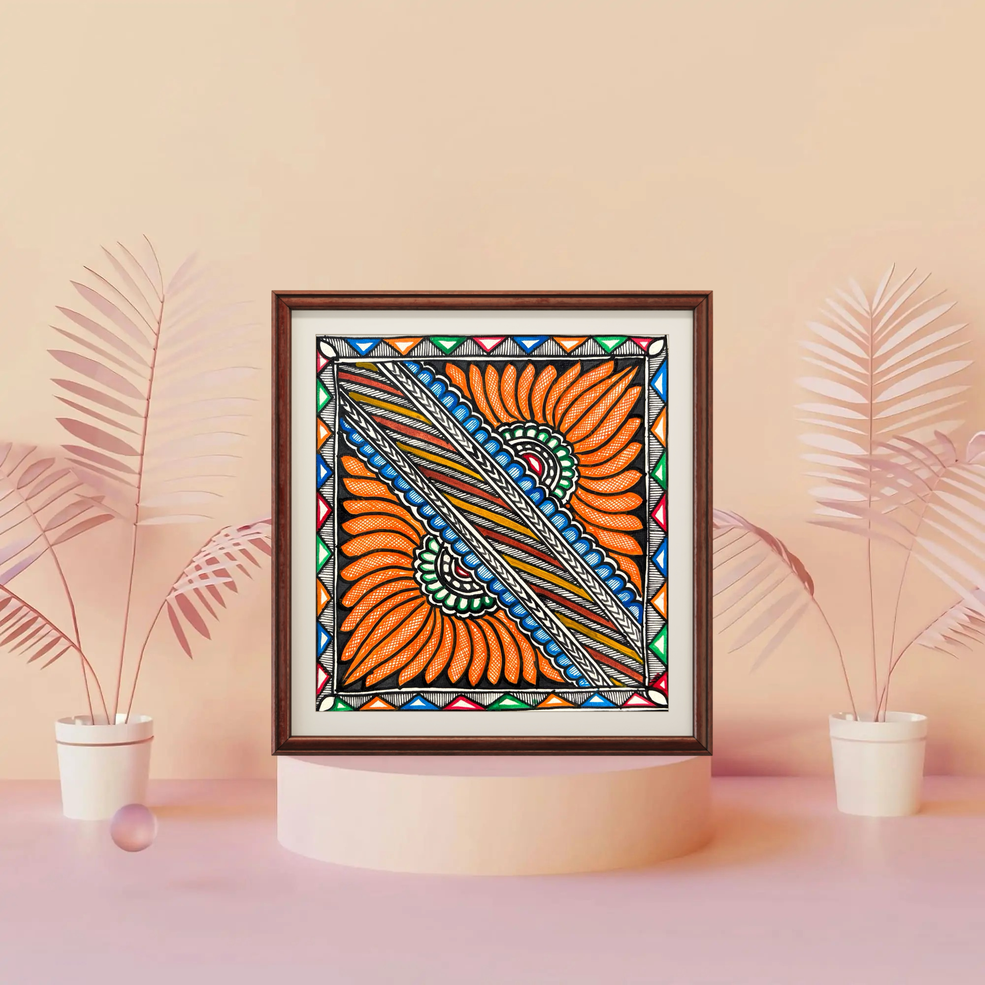 The kamal (lotus) is one of the most sacred motifs in Indian tradition, symbolizing purity, enlightenment, and divine energy. This Madhubani painting showcases a beautifully detailed lotus rendered in vibrant hues, with bold geometric borders enhancing its symmetry and charm. The intricate linework and bright natural colors highlight the grace and spiritual significance of the lotus as it rises unstained from the mud, embodying resilience and transcendence.