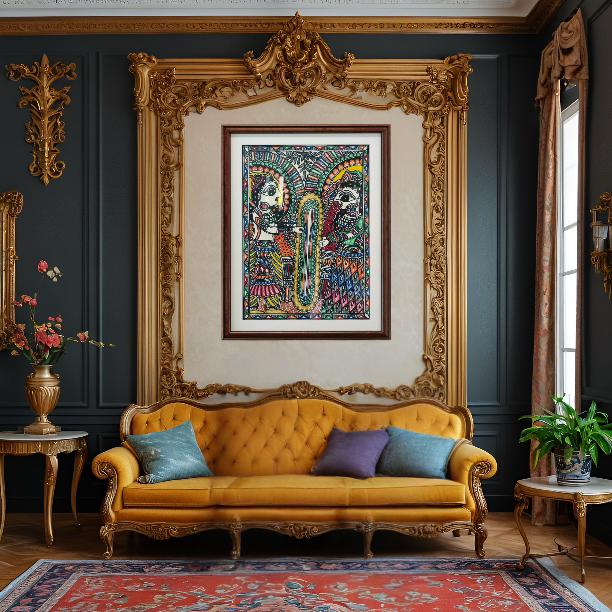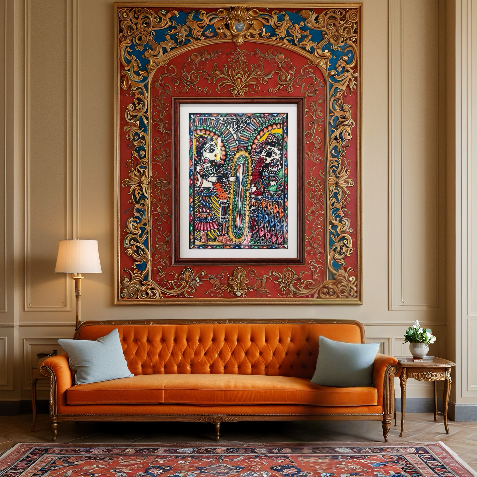 This Madhubani painting, titled Ram Sita Varmaala, depicts the divine moment from the Ramayana when Lord Rama and Goddess Sita exchange garlands during their sacred wedding ceremony. The scene symbolizes eternal love, dharma, and the auspicious bond of marriage in Hindu tradition.