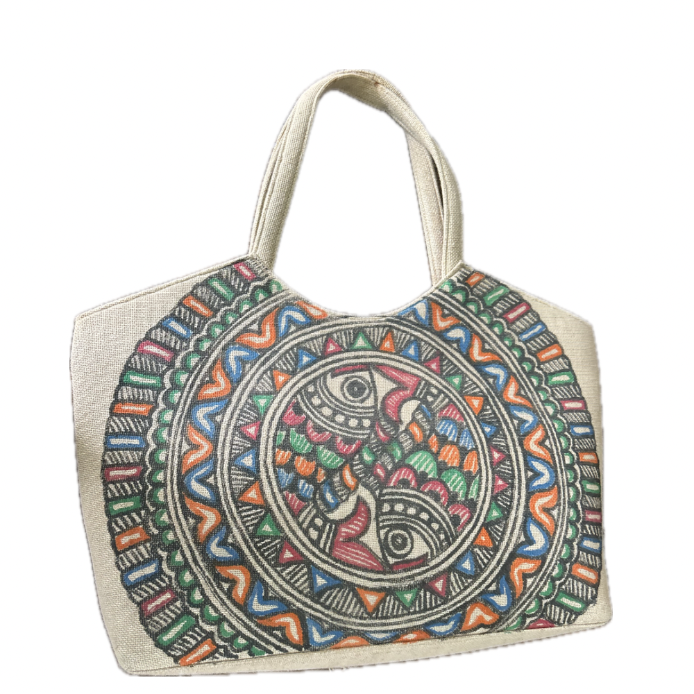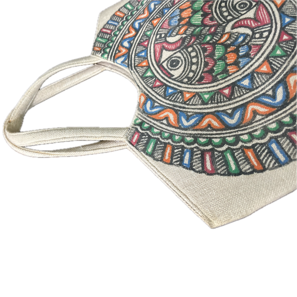 This handcrafted tote bag is adorned with a vibrant Madhubani fish motif, symbolizing prosperity, fertility, and good fortune in Mithila culture. The circular mandala frame represents continuity and balance, while the bold strokes and intricate detailing capture the authentic charm of Madhubani folk art.