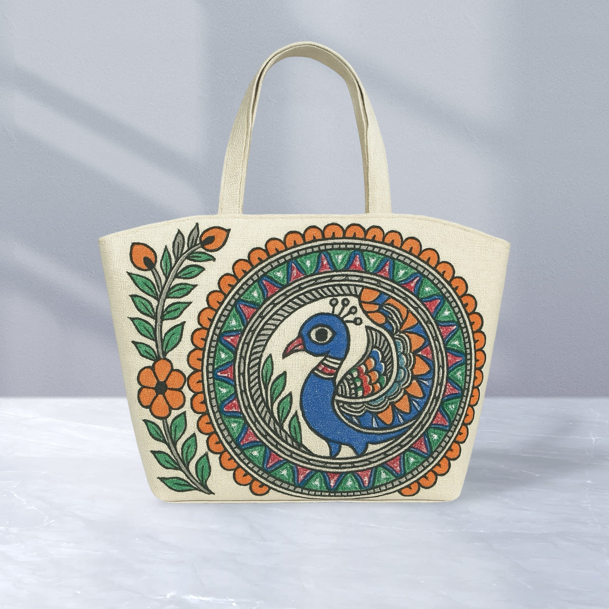 This handcrafted tote bag features a stunning peacock motif, a revered symbol of divinity, love, and beauty in Mithila culture. The elaborate detailing and vibrant, hand-painted feathers capture the majestic charm of this folk art, bringing a touch of traditional elegance to a modern accessory.