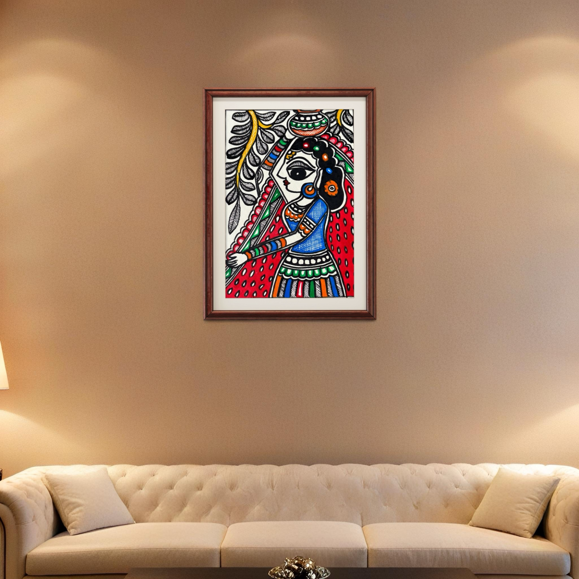 This Madhubani painting, titled Panhaaran Woman, portrays a graceful village woman carrying a pot (matka) on her head, a common sight in rural Mithila that reflects everyday life, tradition, and feminine strength. The artwork celebrates the dignity of women who nurture households while remaining deeply connected to nature and culture.